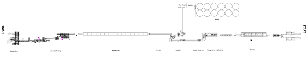 Today, there are “from A to Z” automated lines that work with minimal human intervention. In these systems, after wire drawing, straightening, and cutting, the wire is fed automatically to the extrusion area. On the other side, the raw materials are dosed in an automatic weighing system, then dry-mixed, and after adding water and binders, the coating dough is transferred to the extruder through a dedicated piping system.